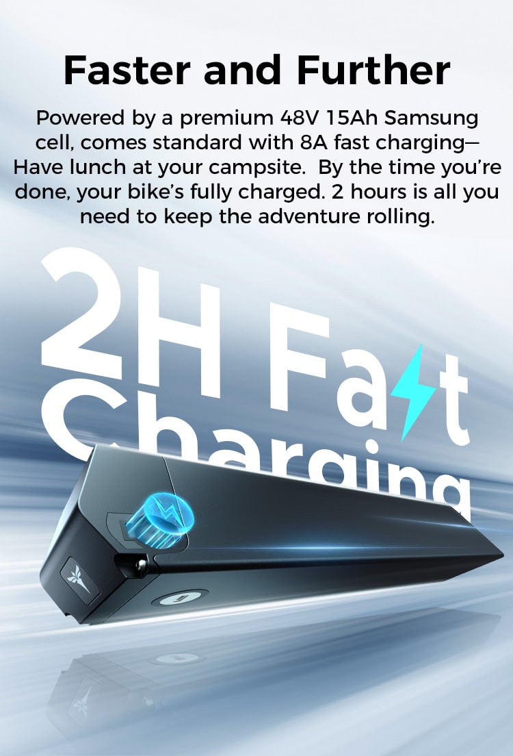 2 Hours Fast Charging: 8A quick charging in as little as two hours is standard on this device, which is powered by a high-end 48V 15Ah Samsung cell. Additionally, the battery is detachable, making charging easy.