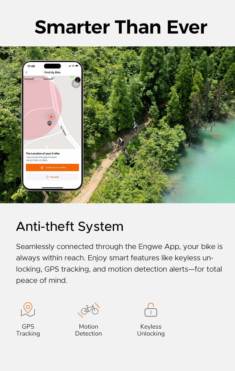 Anti-theft System: Your bike is always accessible thanks to the Engwe App’s seamless connection. For complete peace of mind, take advantage of clever features like motion detection alerts, GPS monitoring, and keyless unlocking.