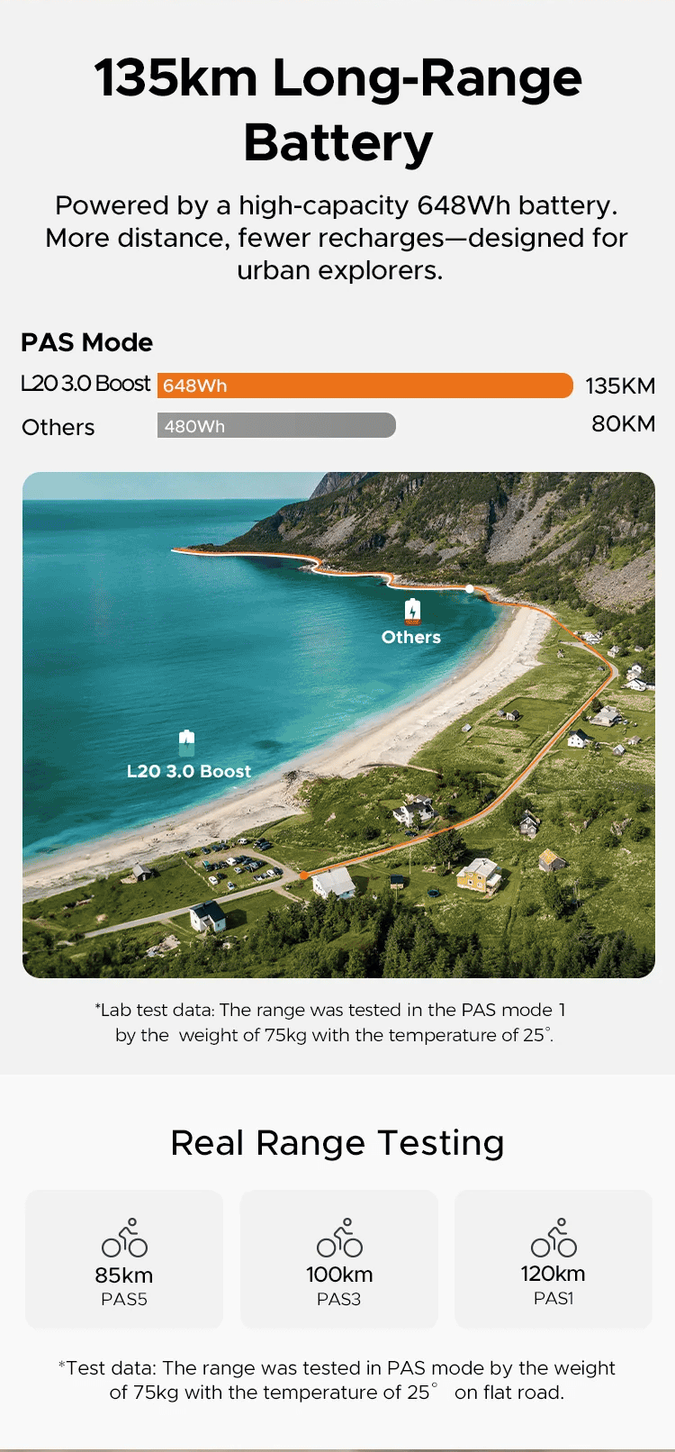 The large-capacity 720 Wh battery provides a maximum range of 160 km in PAS mode for worry-free long-distance riding. In real-world conditions, it reaches 140 km (PAS 1), 110 km (PAS 3), and 96 km (PAS 5), offering customizable range according to user preferences.