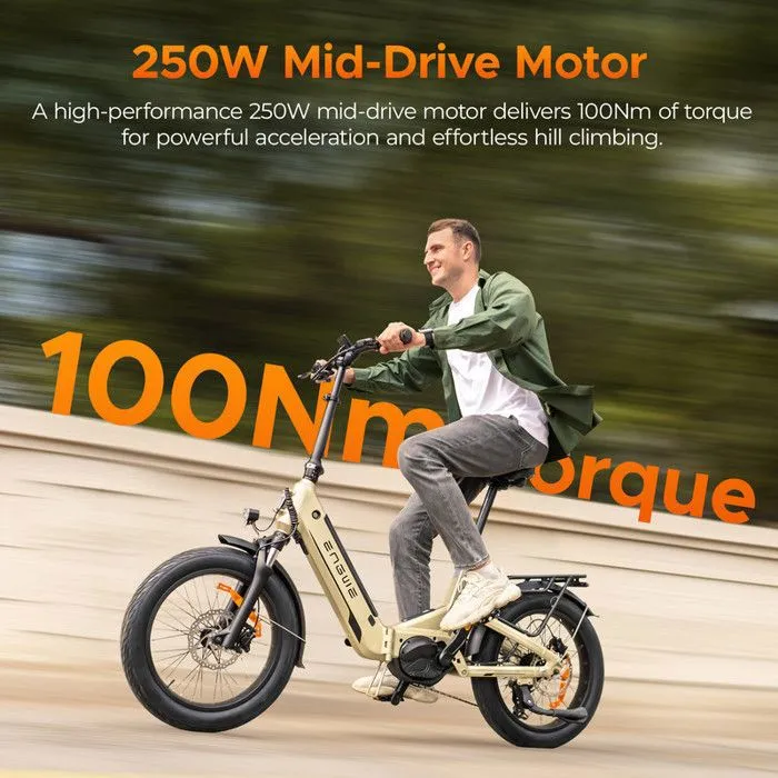 | Specification | Battery: 48V 15Ah (720Wh), Samsung 21700 Cells with BMS Charging Time: About 2 hours Motor: Mivice X700 Mid-Drive, 48V Max torque: 100 Nm Max Speed: 25km/h – 15.5mph Lab-Tested Range: 160 km (Fully Charged) Real World Range: 140 km (PAS 1) – 110 km (PAS 3) – 96 km (PAS 5) Rider Height: 5’1″ – 6’3″ (155cm – 190cm) Max Load: 150kg – 330 lbs Pedal Assist: 5 Levels Frame Material: 6061 Aluminum Alloy Tyre: 20″ × 3.0″ Urban Hybrid Tyres Wheels: 20-inch, 12-gauge Spokes, 36-hole, Double-Wall Aluminum, Black Front Suspension: Hydraulic, Adjustable Lockout, One-Piece Die-Cast Aluminum Rear Suspension: 30mm Travel Transmission: Shimano 7-speed Transmission Charger: 54.6V 8A Output Brake: Hydraulic, Dual-Piston, 180mm Front & Rear Headlight: 30 Lux with Integrated E-Horn Taillight: Automatically Brightens When Braking or Shaking Meter: 3.5″ LCD Color Display, ENGWE-Designed, Mid-Position IOT: ENGWE IOT Module with GPS, 4G, Bluetooth |